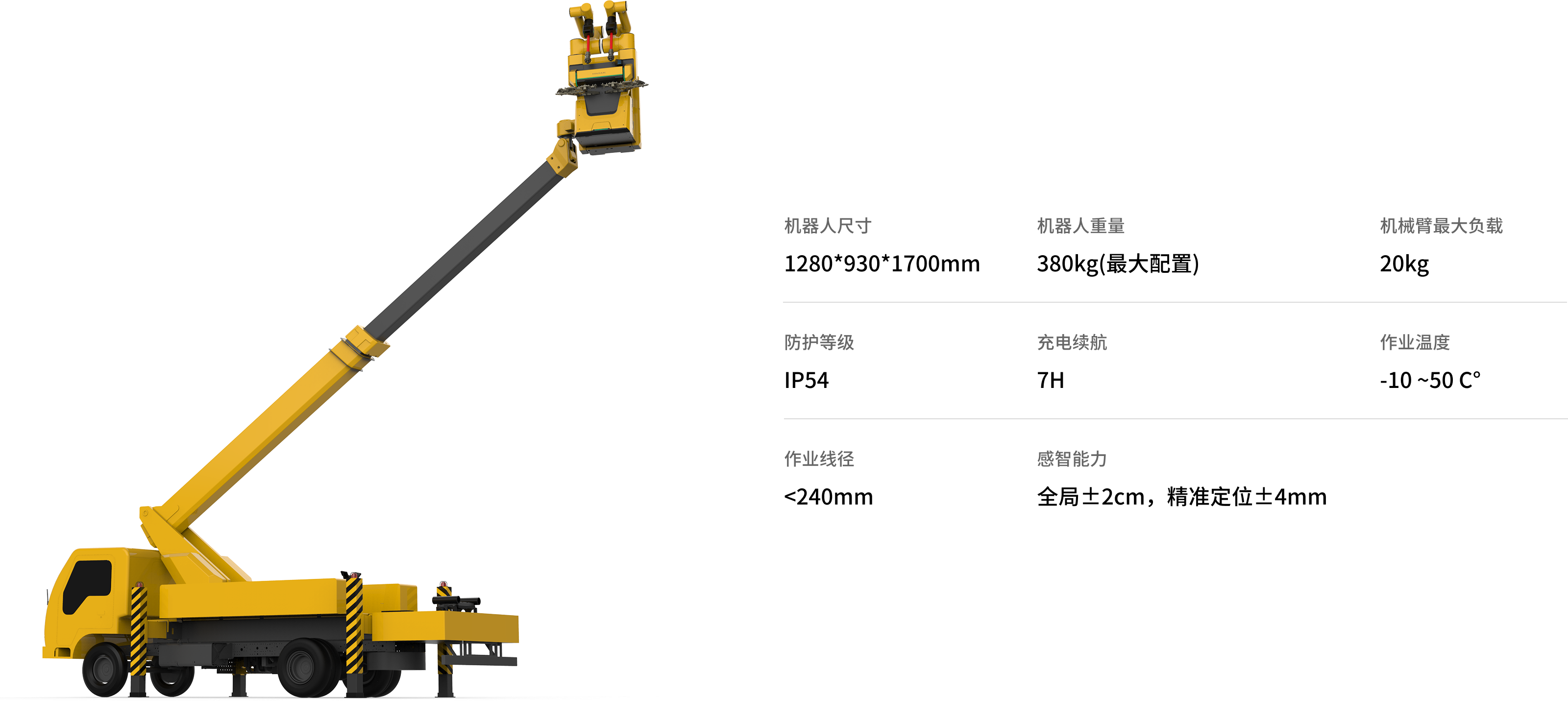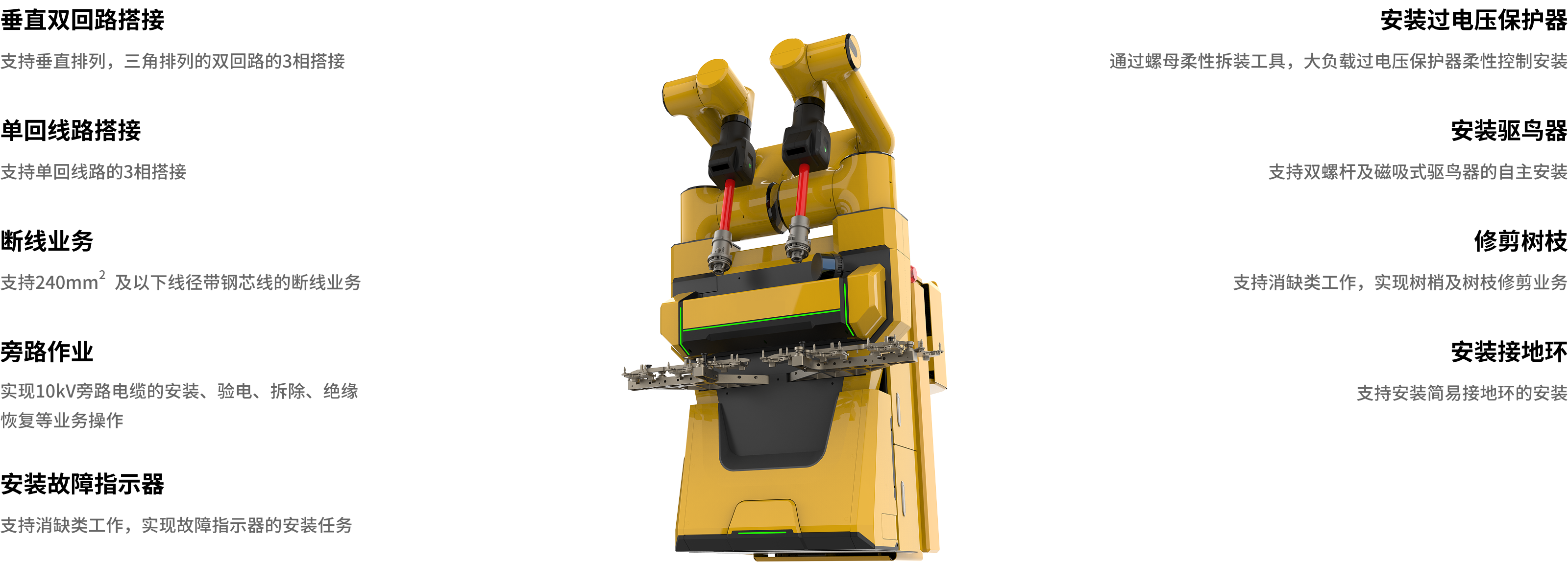 新一代帶電作業機器人適應10kV配網架空線路,實現10kV桿塔及線路帶電運維檢修作業,在手臂負載、作業高度、感知精度、作業方式進行增強設計。業務類型由單回路搭接、斷線業務擴展到大跨距、大持重類作業場景,新增業務包括垂直雙回線路搭接、旁路作業、安裝過電壓保護器等作業場景。